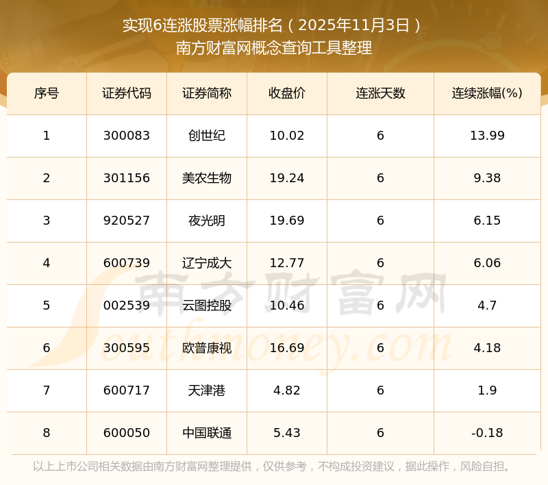 2025年11月3日實(shí)現(xiàn)6連漲股票漲幅排名