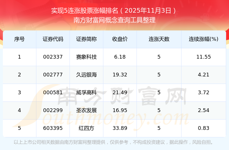 根據(jù)南方財富網概念查詢工具數(shù)據(jù)統(tǒng)計,截止2025年11月3日收盤,共有5只個股實現(xiàn)5天連漲。其中連續(xù)漲幅較大的個股有賽象科技、久遠銀海、威孚高科等,連續(xù)漲幅分別為11.55%、4.21%、3.72%。