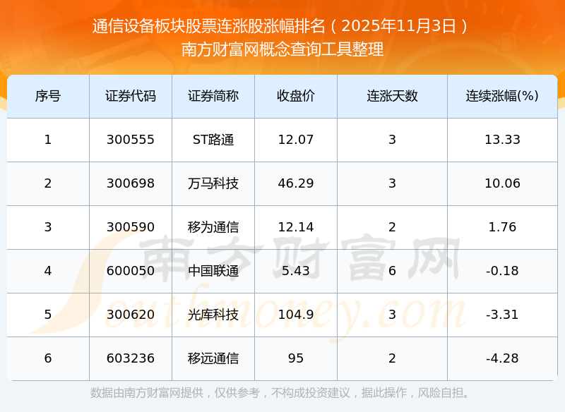 根據(jù)南方財富網(wǎng)概念查詢工具數(shù)據(jù)統(tǒng)計,截止2025年11月3日收盤,通信設(shè)備板塊股票共有6只個股實現(xiàn)連漲。其中連續(xù)漲幅較大的個股有ST路通、萬馬科技、移為通信等,連續(xù)漲幅分別為13.33%、10.06%、1.76%。