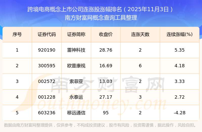 2025年11月3日跨境電商概念上市公司連漲股漲幅排名