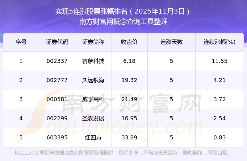 2025年11月3日實現(xiàn)5連漲股票漲幅排名
