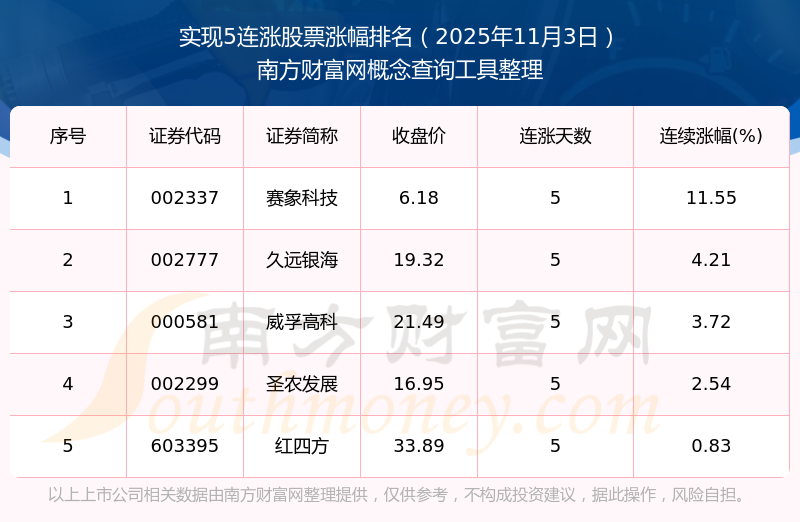2025年11月3日實現(xiàn)5連漲股票漲幅排名