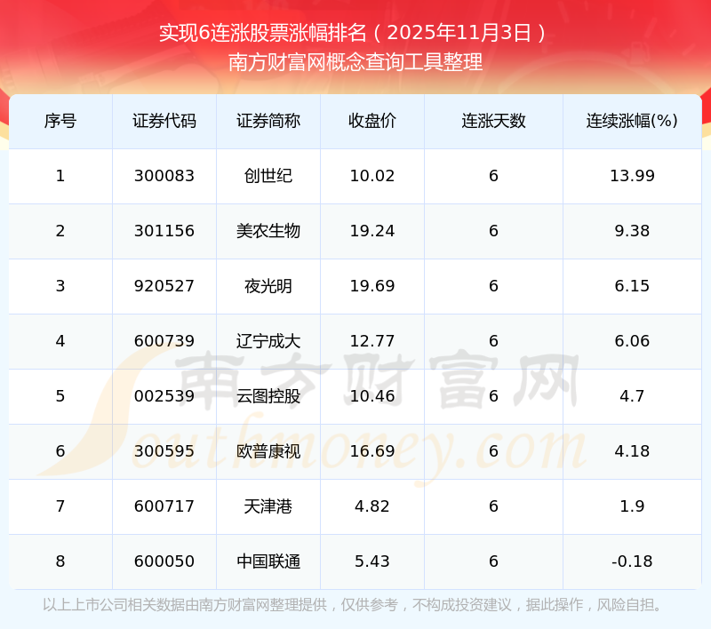 2025年11月3日實(shí)現(xiàn)6連漲股票漲幅排名