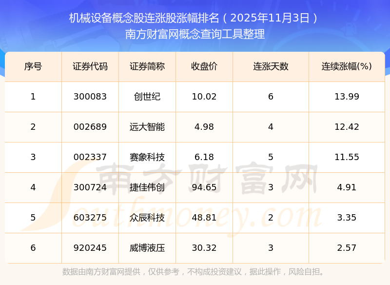 2025年11月3日機(jī)械設(shè)備概念股連漲股漲幅排名
