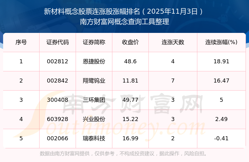 2025年11月3日新材料概念股票連漲股漲幅排名