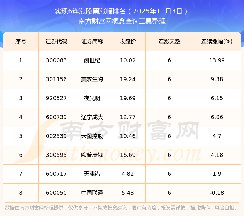2025年11月3日實現(xiàn)6連漲股票漲幅排名