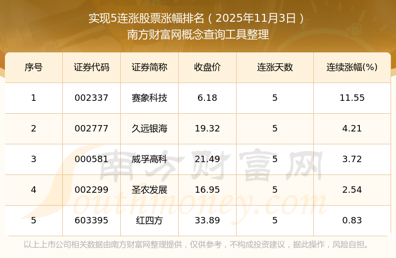 根據(jù)南方財(cái)富網(wǎng)概念查詢工具數(shù)據(jù)統(tǒng)計(jì),截止2025年11月3日收盤,共有5只個股實(shí)現(xiàn)5天連漲。其中連續(xù)漲幅較大的個股有賽象科技、久遠(yuǎn)銀海、威孚高科等,連續(xù)漲幅分別為11.55%、4.21%、3.72%。