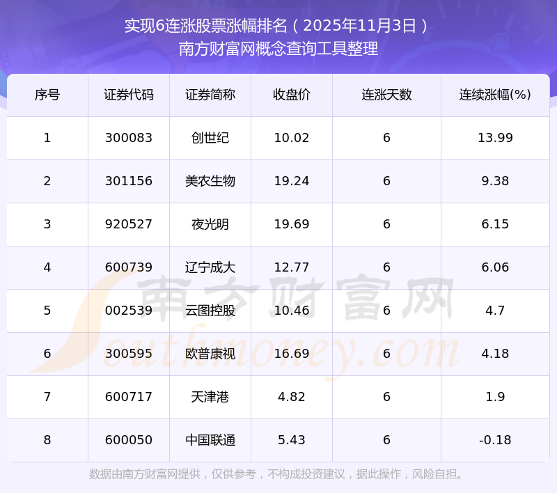 2025年11月3日實(shí)現(xiàn)6連漲股票漲幅排名