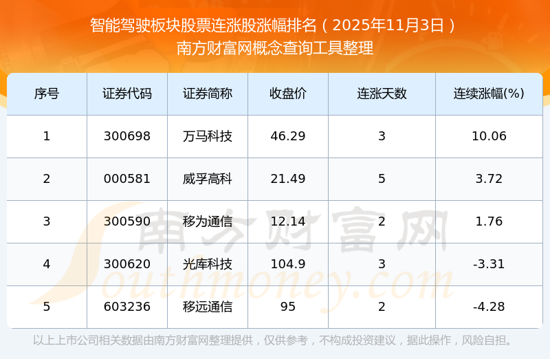 根據(jù)南方財富網(wǎng)概念查詢工具數(shù)據(jù)統(tǒng)計,截止2025年11月3日收盤,智能駕駛板塊股票共有5只個股實現(xiàn)連漲。其中連續(xù)漲幅較大的個股有萬馬科技、威孚高科、移為通信等,連續(xù)漲幅分別為10.06%、3.72%、1.76%。
