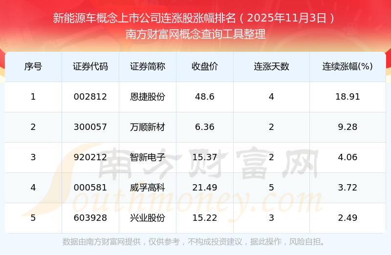 根據(jù)南方財富網(wǎng)概念查詢工具數(shù)據(jù)統(tǒng)計,截止2025年11月3日收盤,新能源車概念上市公司共有5只個股實現(xiàn)連漲。其中連續(xù)漲幅較大的個股有恩捷股份、萬順新材、智新電子等,連續(xù)漲幅分別為18.91%、9.28%、4.06%。