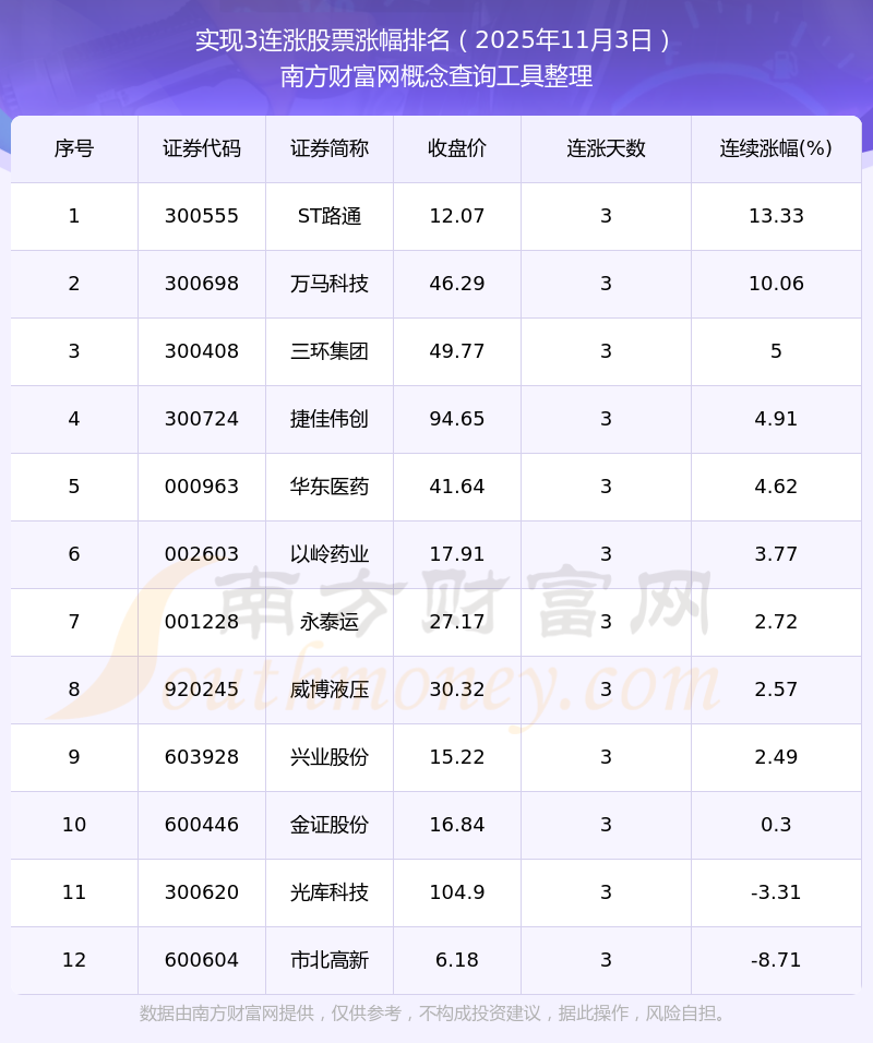 2025年11月3日實現(xiàn)3連漲股票漲幅排名