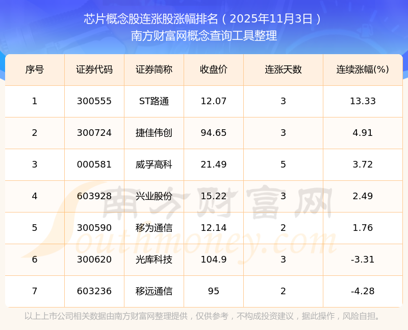 根據(jù)南方財富網(wǎng)概念查詢工具數(shù)據(jù)統(tǒng)計,截止2025年11月3日收盤,芯片概念股共有7只個股實現(xiàn)連漲。其中連續(xù)漲幅較大的個股有ST路通、捷佳偉創(chuàng)、威孚高科等,連續(xù)漲幅分別為13.33%、4.91%、3.72%。