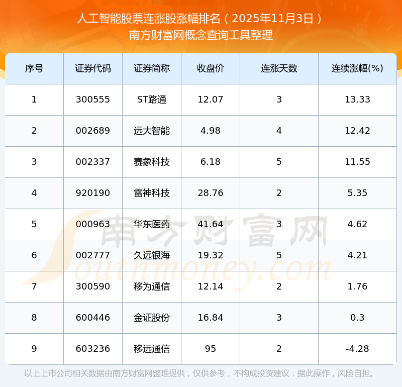 根據(jù)南方財富網(wǎng)概念查詢工具數(shù)據(jù)統(tǒng)計,截止2025年11月3日收盤,人工智能股票共有9只個股實現(xiàn)連漲。其中連續(xù)漲幅較大的個股有ST路通、遠大智能、賽象科技等,連續(xù)漲幅分別為13.33%、12.42%、11.55%。