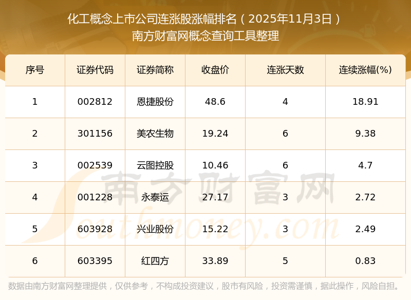 2025年11月3日化工概念上市公司連漲股漲幅排名
