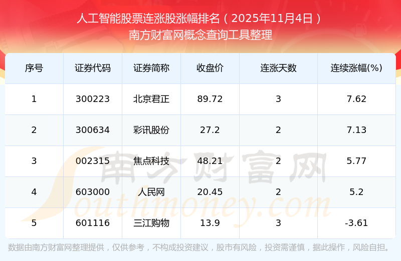 根據(jù)南方財(cái)富網(wǎng)概念查詢(xún)工具數(shù)據(jù)統(tǒng)計(jì),截止2025年11月4日收盤(pán),人工智能股票共有5只個(gè)股實(shí)現(xiàn)連漲。其中連續(xù)漲幅較大的個(gè)股有北京君正、彩訊股份、焦點(diǎn)科技等,連續(xù)漲幅分別為7.62%、7.13%、5.77%。