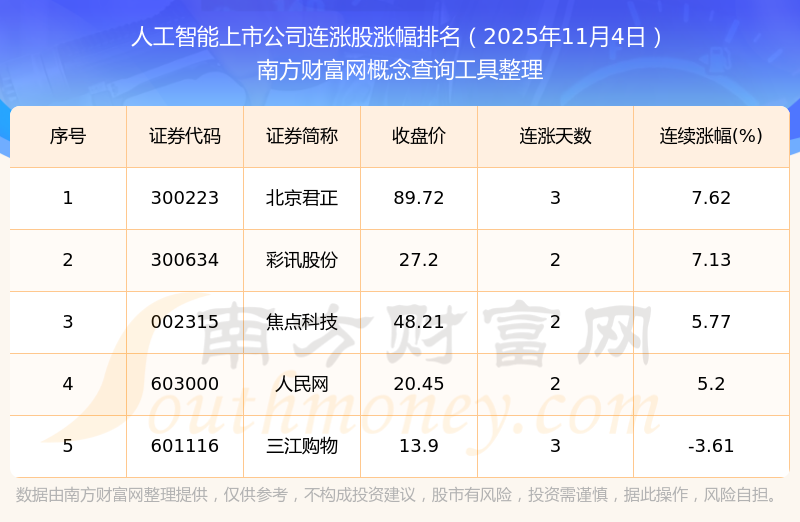 2025年11月4日人工智能上市公司連漲股漲幅排名