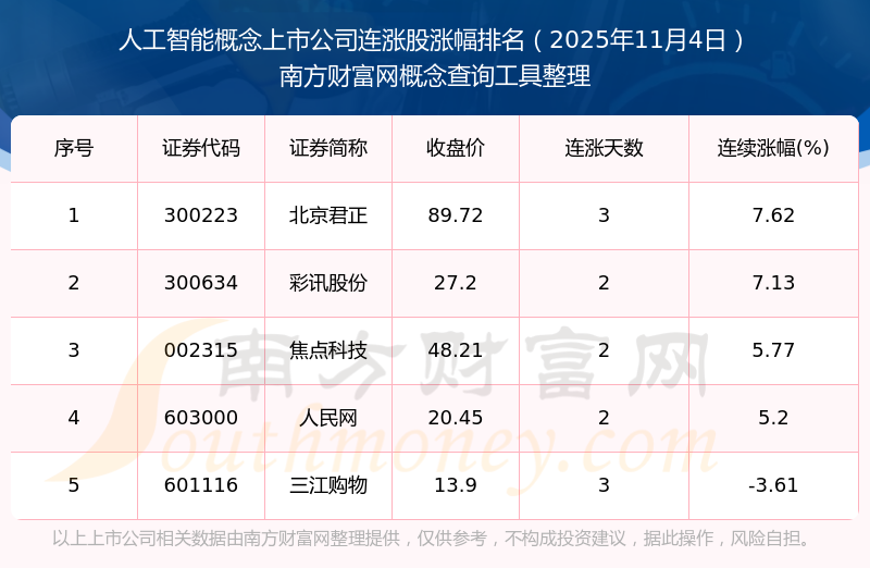 2025年11月4日人工智能概念上市公司連漲股漲幅排名