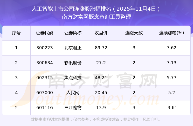 2025年11月4日人工智能上市公司連漲股漲幅排名