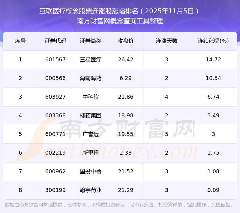 2025年11月5日互聯(lián)醫(yī)療概念股票連漲股漲幅排名