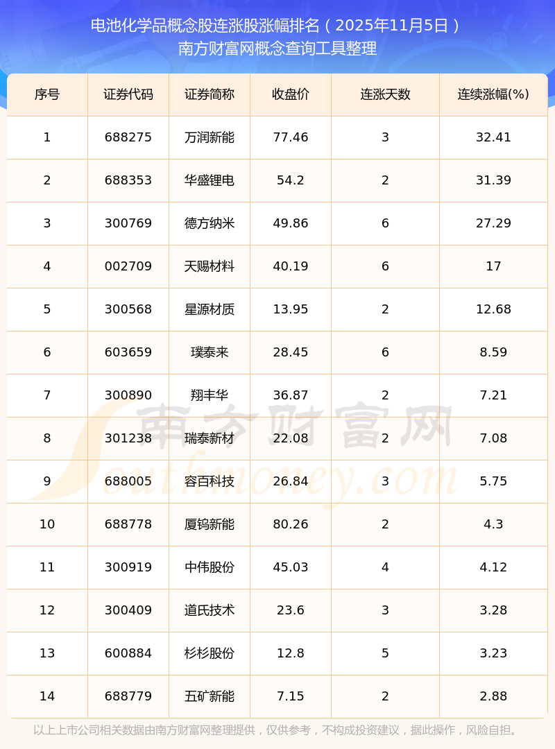 2025年11月5日電池化學(xué)品概念股連漲股漲幅排名