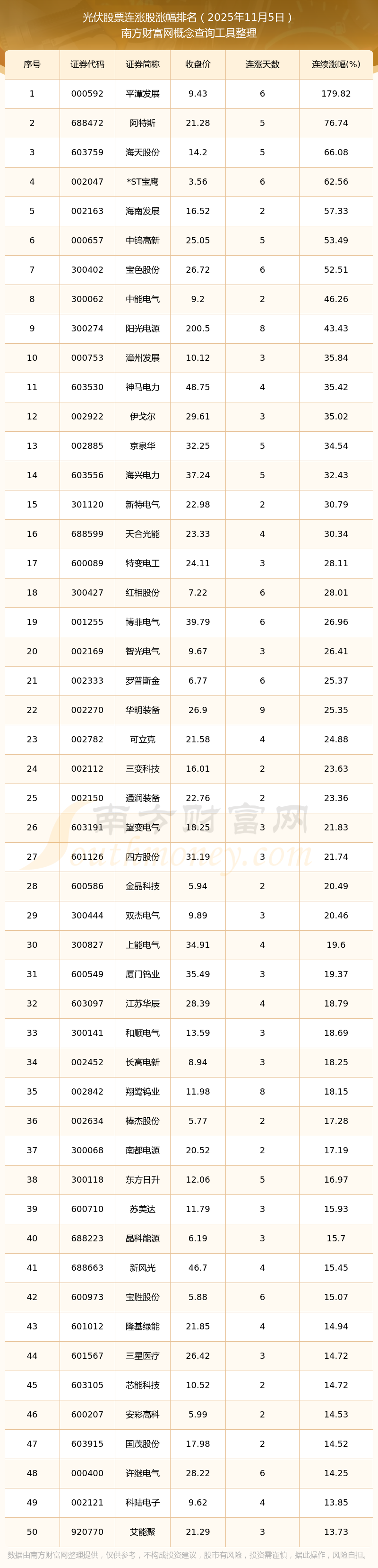 根據(jù)南方財(cái)富網(wǎng)概念查詢工具數(shù)據(jù)統(tǒng)計(jì),截止2025年11月5日收盤(pán),光伏股票共有175只個(gè)股實(shí)現(xiàn)連漲。其中連續(xù)漲幅較大的個(gè)股有平潭發(fā)展、阿特斯、海天股份等,連續(xù)漲幅分別為179.82%、76.74%、66.08%。