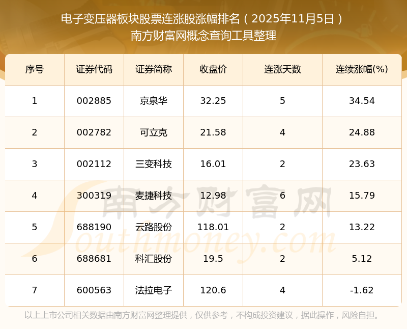 2025年11月5日電子變壓器板塊股票共有7只個(gè)股實(shí)現(xiàn)連漲