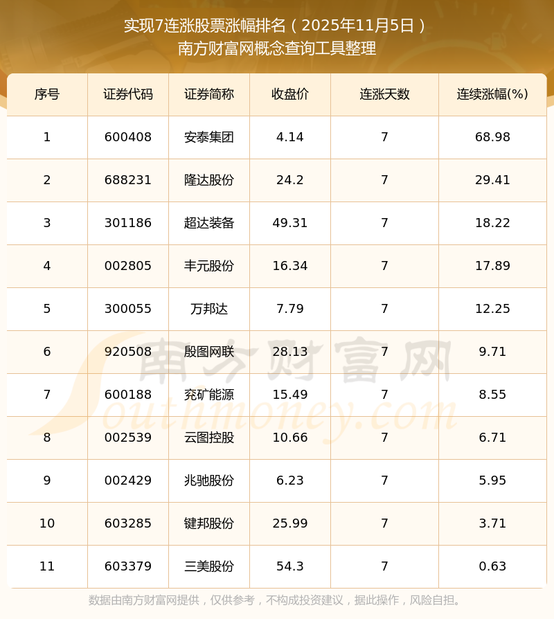 2025年11月5日實(shí)現(xiàn)7連漲股票漲幅排名
