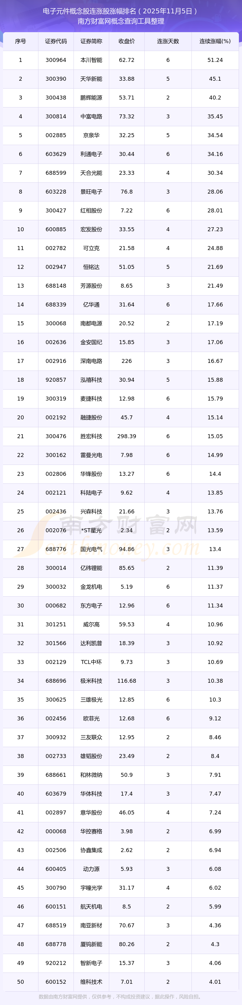 2025年11月5日電子元件概念股連漲股漲幅排名