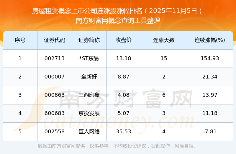 根據(jù)南方財(cái)富網(wǎng)概念查詢工具數(shù)據(jù)統(tǒng)計(jì),截止2025年11月5日收盤,房屋租賃概念上市公司共有5只個(gè)股實(shí)現(xiàn)連漲。其中連續(xù)漲幅較大的個(gè)股有*ST東易、全新好、三湘印象等,連續(xù)漲幅分別為154.93%、21.34%、13.97%。
