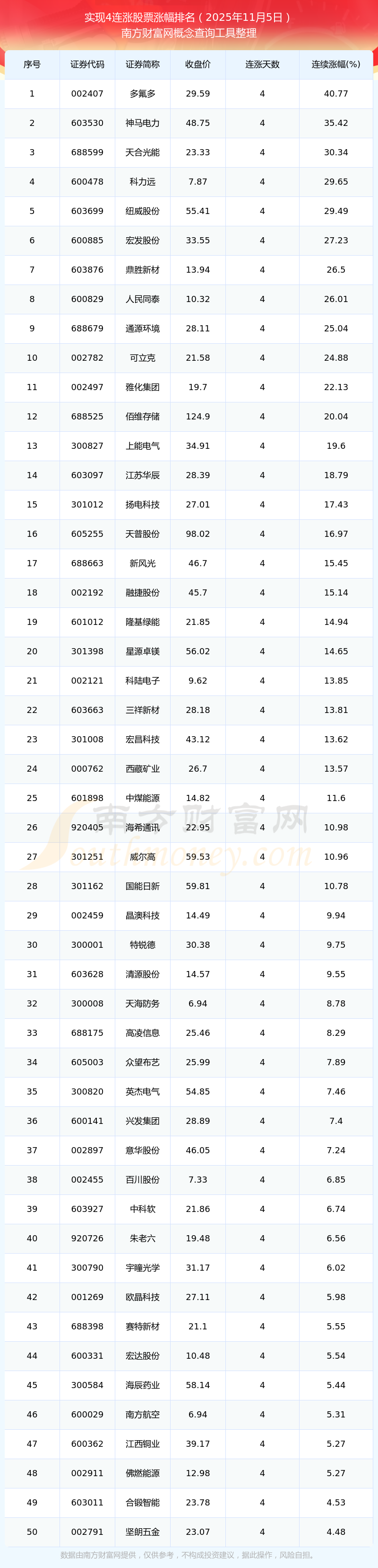 根據(jù)南方財(cái)富網(wǎng)概念查詢工具數(shù)據(jù)統(tǒng)計(jì),截止2025年11月5日收盤,共有65只個(gè)股實(shí)現(xiàn)4天連漲。其中連續(xù)漲幅較大的個(gè)股有多氟多、神馬電力、天合光能等,連續(xù)漲幅分別為40.77%、35.42%、30.34%。