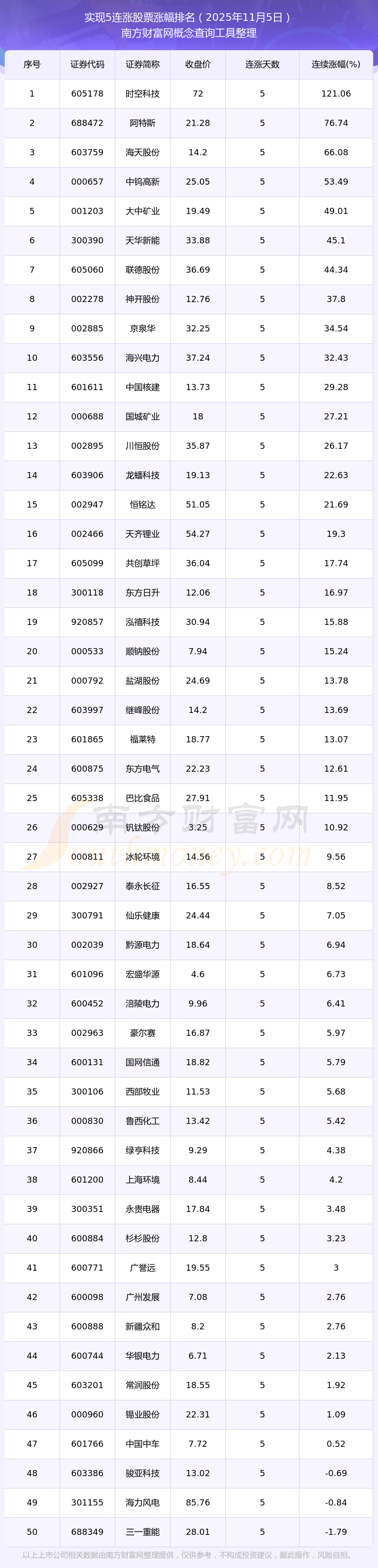 根據(jù)南方財富網(wǎng)概念查詢工具數(shù)據(jù)統(tǒng)計,截止2025年11月5日收盤,共有56只個股實現(xiàn)5天連漲。其中連續(xù)漲幅較大的個股有時空科技、阿特斯、海天股份等,連續(xù)漲幅分別為121.06%、76.74%、66.08%。