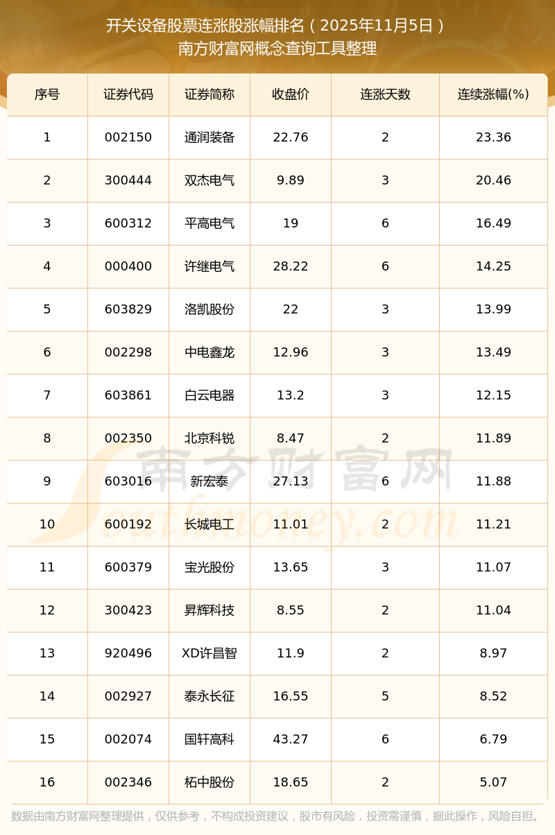 2025年11月5日開(kāi)關(guān)設(shè)備股票連漲股漲幅排名