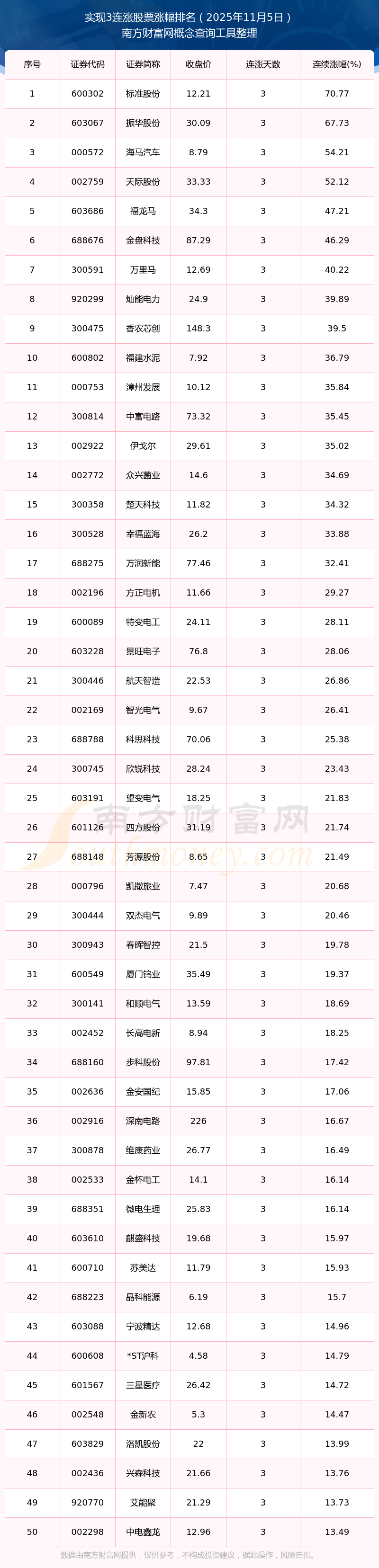 2025年11月5日實(shí)現(xiàn)3連漲股票漲幅排名