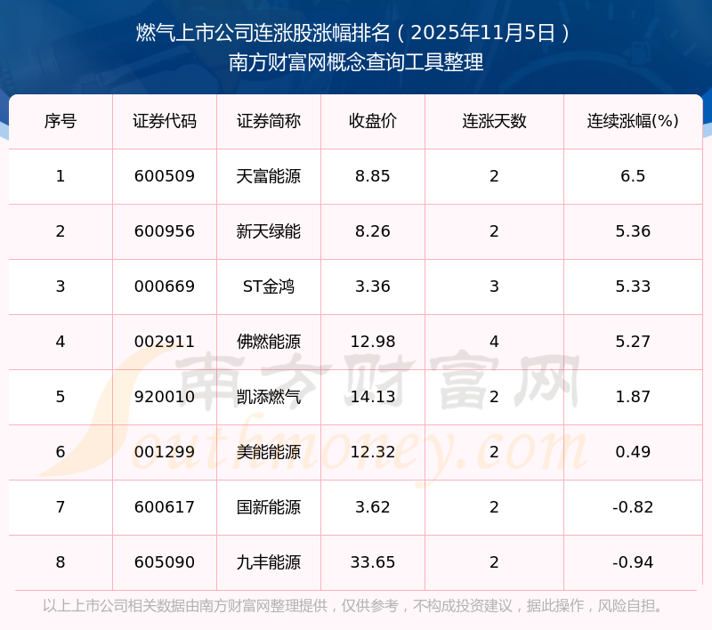 2025年11月5日燃?xì)馍鲜泄具B漲股漲幅排名