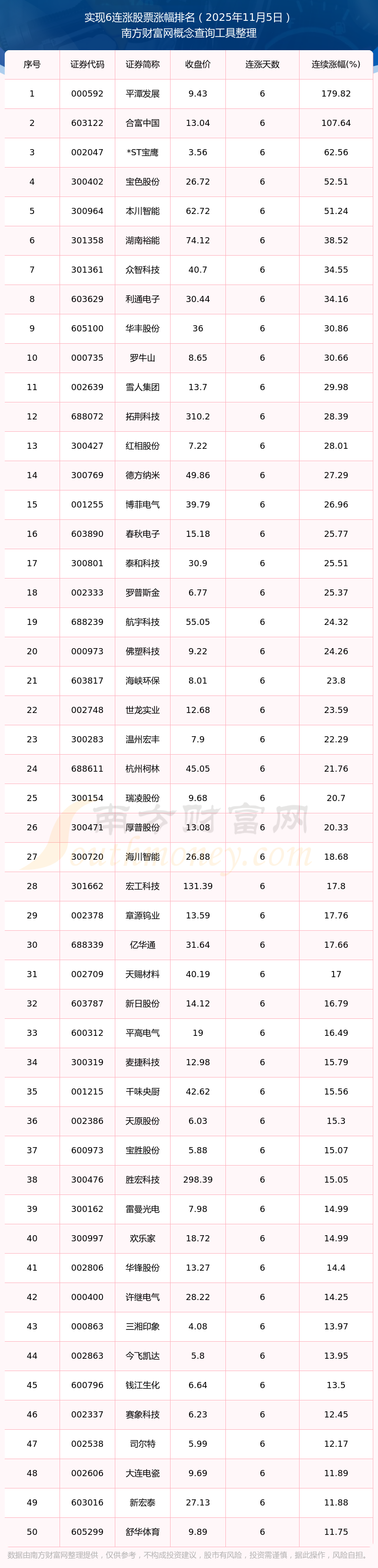 2025年11月5日實現(xiàn)6連漲股票漲幅排名