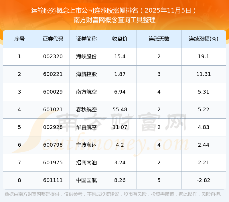2025年11月5日運(yùn)輸服務(wù)概念上市公司連漲股漲幅排名