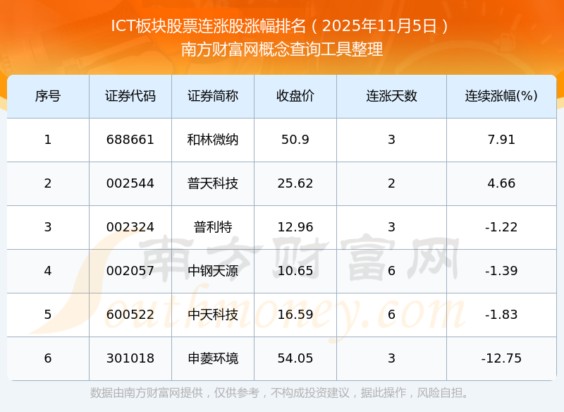 根據(jù)南方財富網(wǎng)概念查詢工具數(shù)據(jù)統(tǒng)計,截止2025年11月5日收盤,ICT板塊股票共有6只個股實現(xiàn)連漲。其中連續(xù)漲幅較大的個股有和林微納、普天科技、普利特等,連續(xù)漲幅分別為7.91%、4.66%、-1.22%。