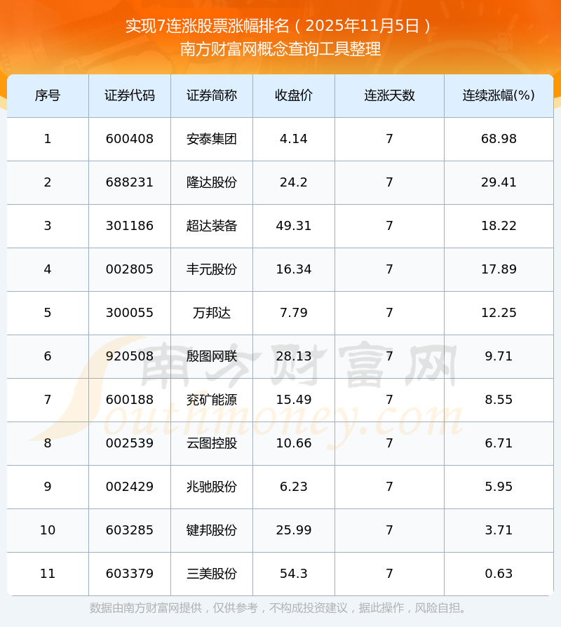根據(jù)南方財富網(wǎng)概念查詢工具數(shù)據(jù)統(tǒng)計,截止2025年11月5日收盤,共有11只個股實現(xiàn)7天連漲。其中連續(xù)漲幅較大的個股有安泰集團、隆達股份、超達裝備等,連續(xù)漲幅分別為68.98%、29.41%、18.22%。