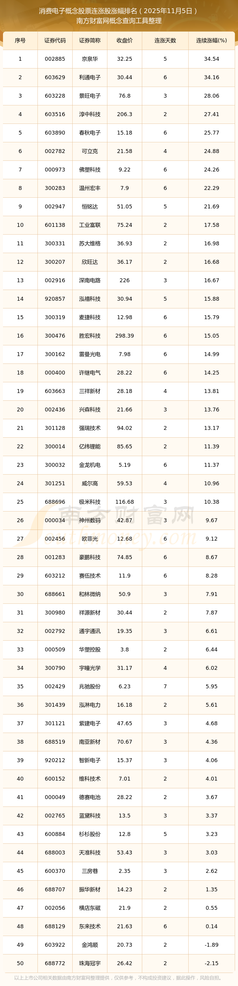 2025年11月5日消費電子概念股票連漲股票漲幅排名