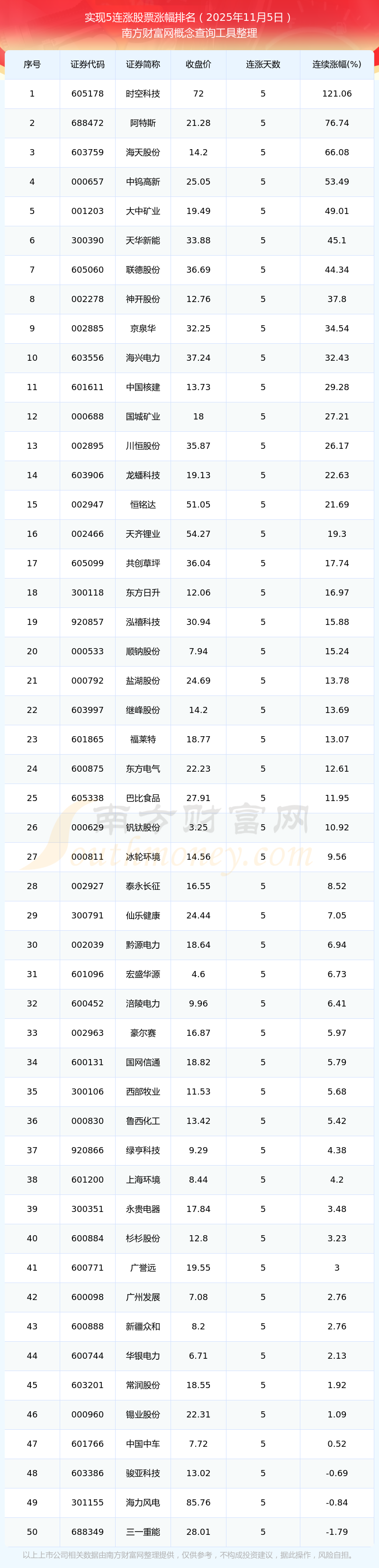 2025年11月5日實現(xiàn)5連漲股票漲幅排名