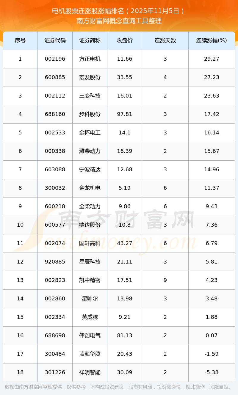 2025年11月5日電機(jī)股票連漲股漲幅排名