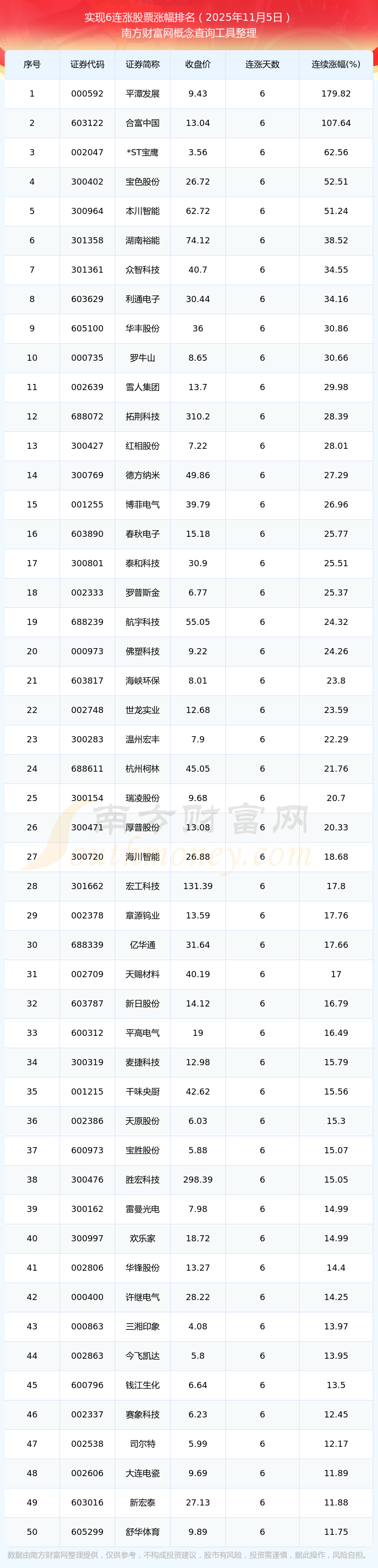 根據(jù)南方財(cái)富網(wǎng)概念查詢工具數(shù)據(jù)統(tǒng)計(jì),截止2025年11月5日收盤,共有109只個(gè)股實(shí)現(xiàn)6天連漲。其中連續(xù)漲幅較大的個(gè)股有平潭發(fā)展、合富中國、*ST寶鷹等,連續(xù)漲幅分別為179.82%、107.64%、62.56%。