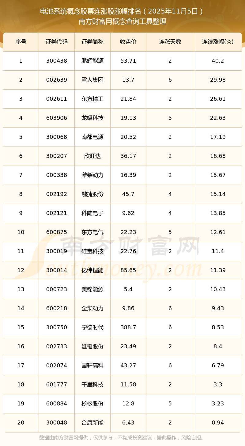 2025年11月5日電池系統(tǒng)概念股票連漲股漲幅排名