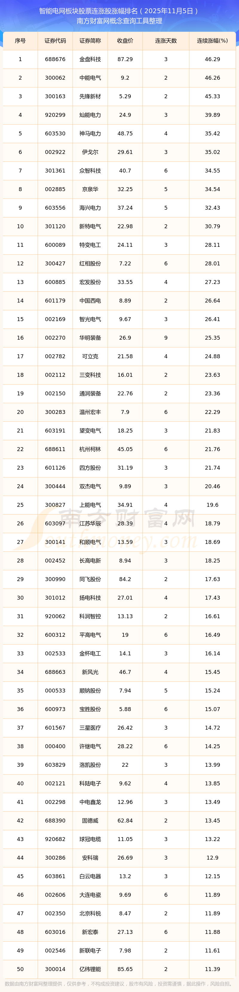 根據(jù)南方財(cái)富網(wǎng)概念查詢工具數(shù)據(jù)統(tǒng)計(jì),截止2025年11月5日收盤,智能電網(wǎng)板塊股票共有111只個(gè)股實(shí)現(xiàn)連漲。其中連續(xù)漲幅較大的個(gè)股有金盤科技、中能電氣、先鋒新材等,連續(xù)漲幅分別為46.29%、46.26%、45.33%。