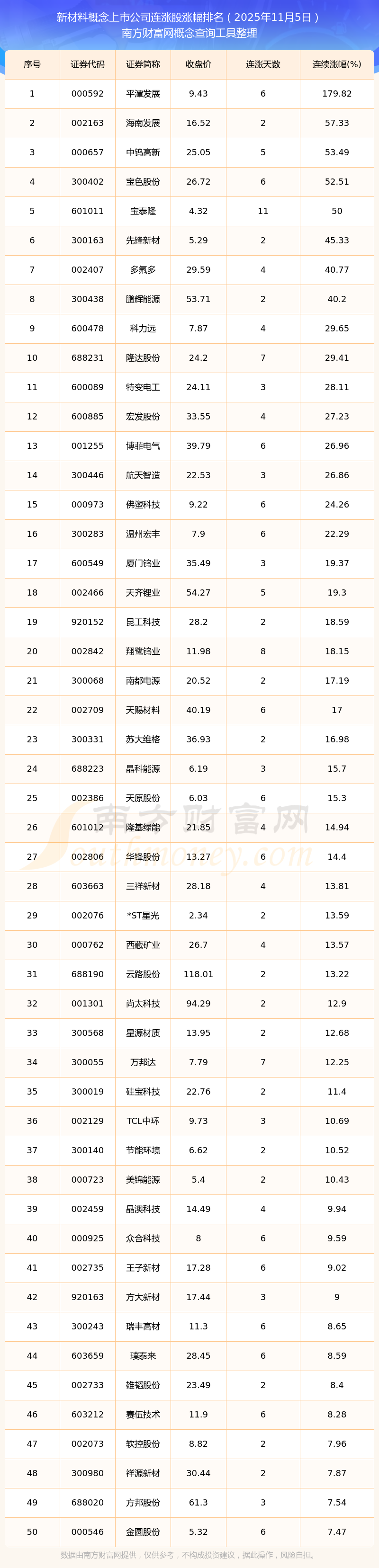2025年11月5日新材料概念上市公司連漲股漲幅排名