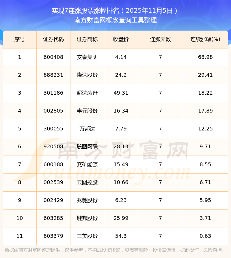 根據(jù)南方財富網(wǎng)概念查詢工具數(shù)據(jù)統(tǒng)計,截止2025年11月5日收盤,共有11只個股實現(xiàn)7天連漲。其中連續(xù)漲幅較大的個股有安泰集團、隆達股份、超達裝備等,連續(xù)漲幅分別為68.98%、29.41%、18.22%。