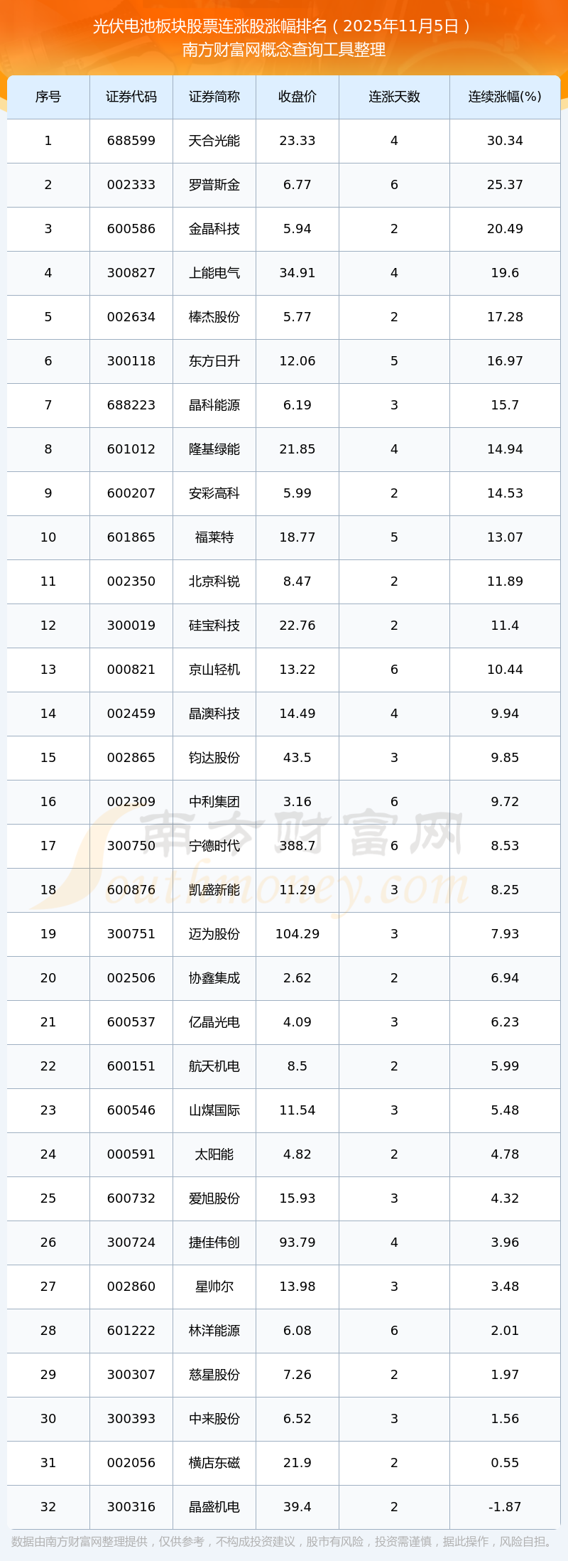 2025年11月5日光伏電池板塊股票連漲股漲幅排名