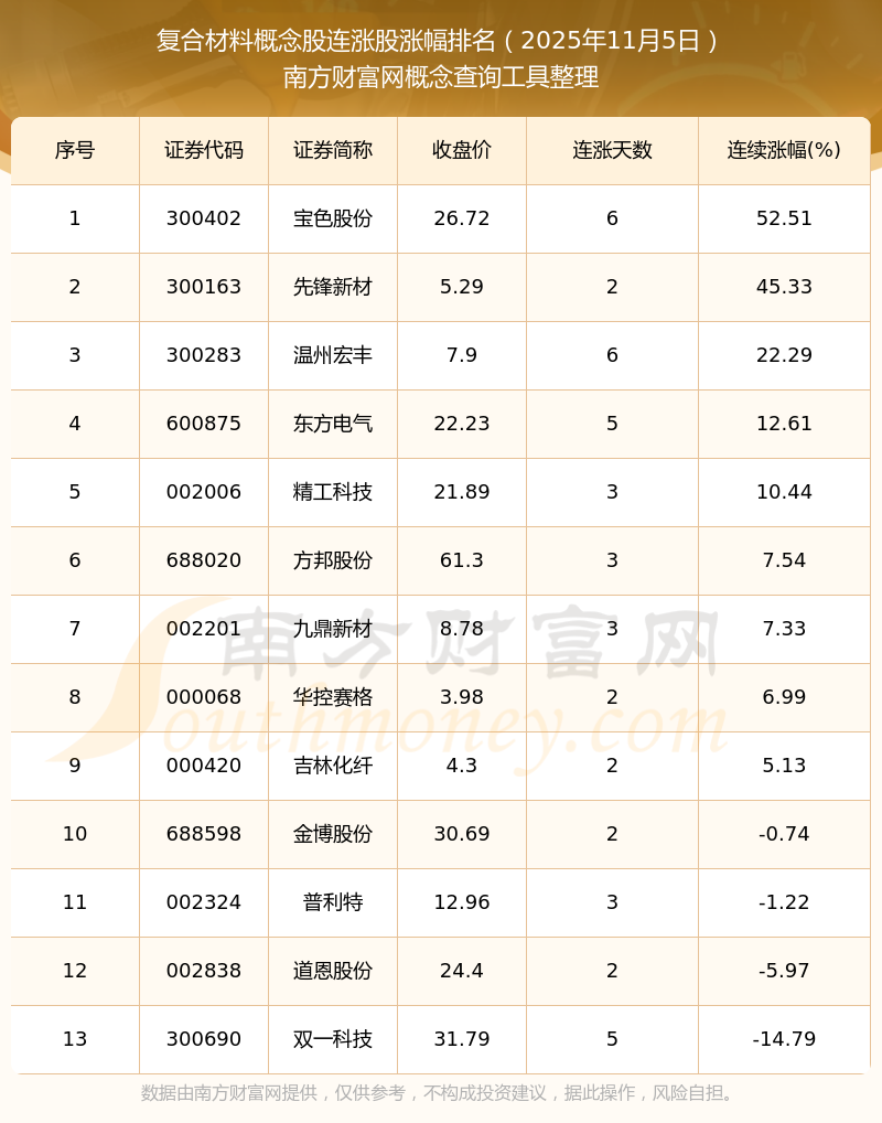 2025年11月5日復(fù)合材料概念股連漲股漲幅排名