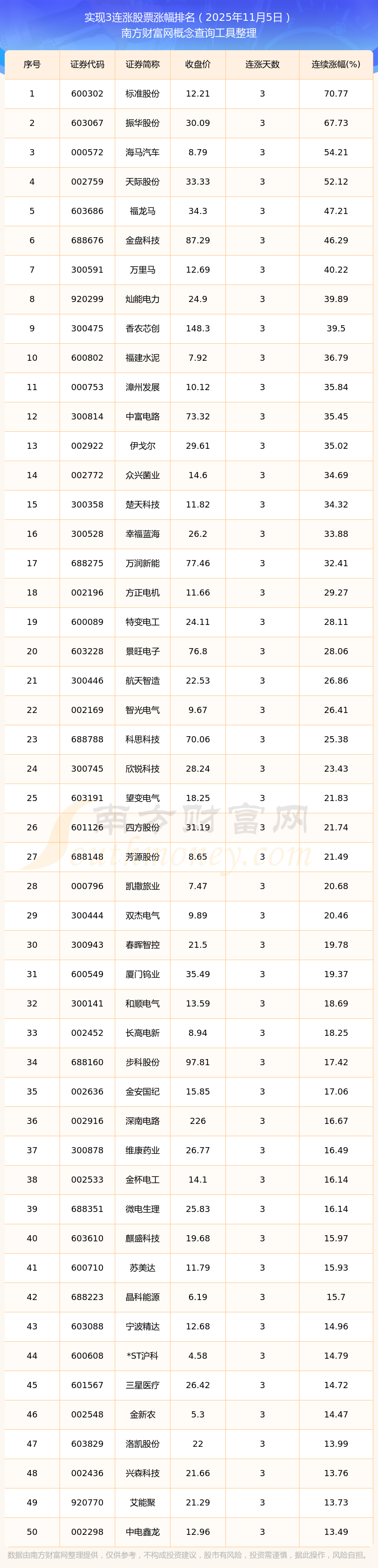 2025年11月5日實(shí)現(xiàn)3連漲股票漲幅排名