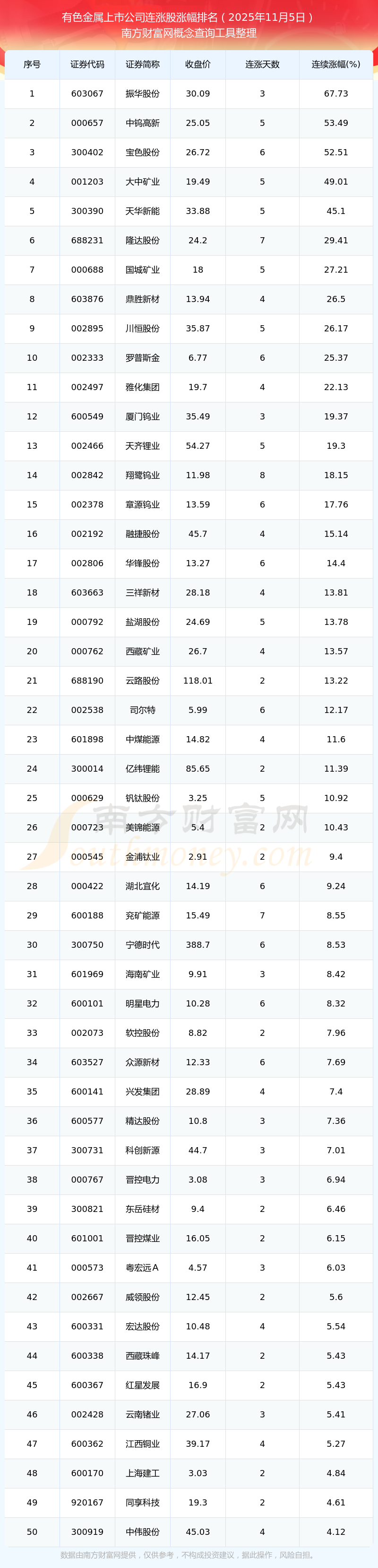 2025年11月5日有色金屬上市公司連漲股漲幅排名